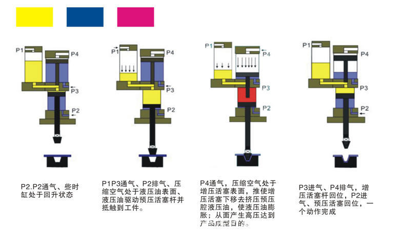 低壓提高十倍供應油壓缸使用,從而達到成型的目的。